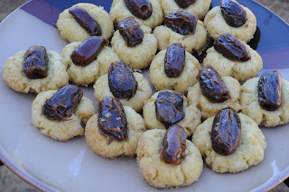- Break off pieces of the dough and roll into 1 1/2 inch balls. Place on an ungreased cookie sheet, and press one date into the center of each cookie.
